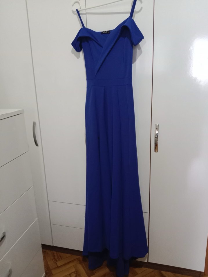 Mavi renkte, V yakalı ve kolsuz uzun abiye elbise. Drapeli tasarımı, modern klasik stil ve sade görünümüyle düğünler için uygundur.