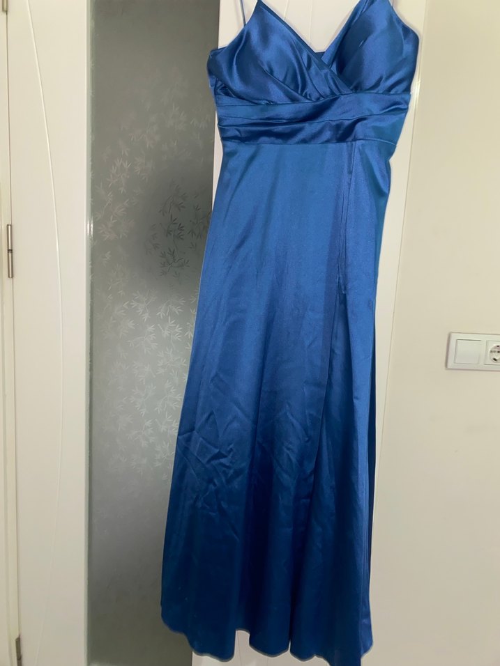 Mavi, parlak dokulu, drapeli ve V yakalı, uzun abiye elbise. Sadece 1 gece kullanıldı 42 44 beden arasıdır