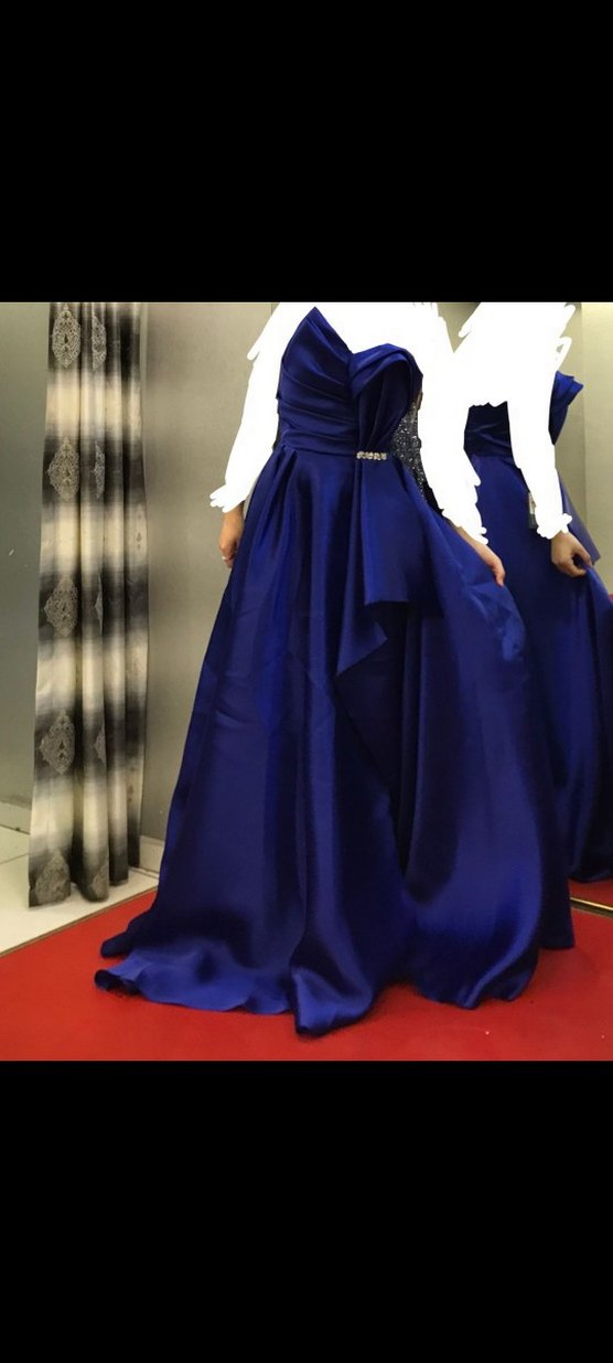 Mavi, drapeli ve desenli parlak kumaştan yapılmış straplez uzun abiyedir. görsele ekledigim gibi ufak bir kusuru bulunur