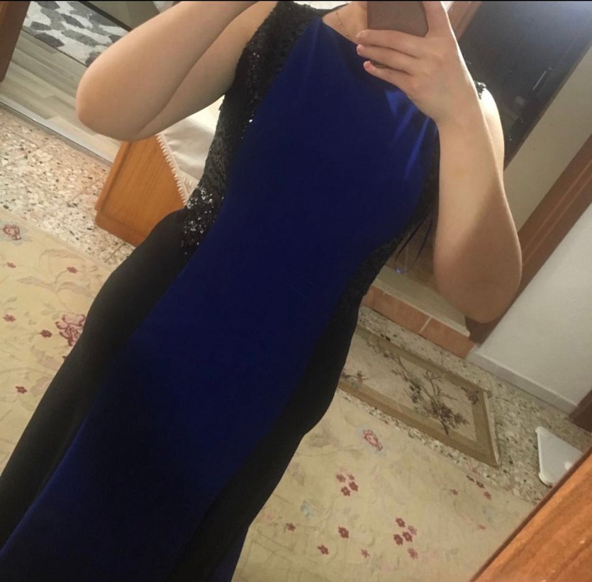 Mavi, v yaka, kolsuz, drapeli ve dar kesim uzun abiye elbise. Gösterişli ve cesur tarzı ile parti için uygundur. Desensiz ve koyu renklidir 42-44 bedene uygundur .