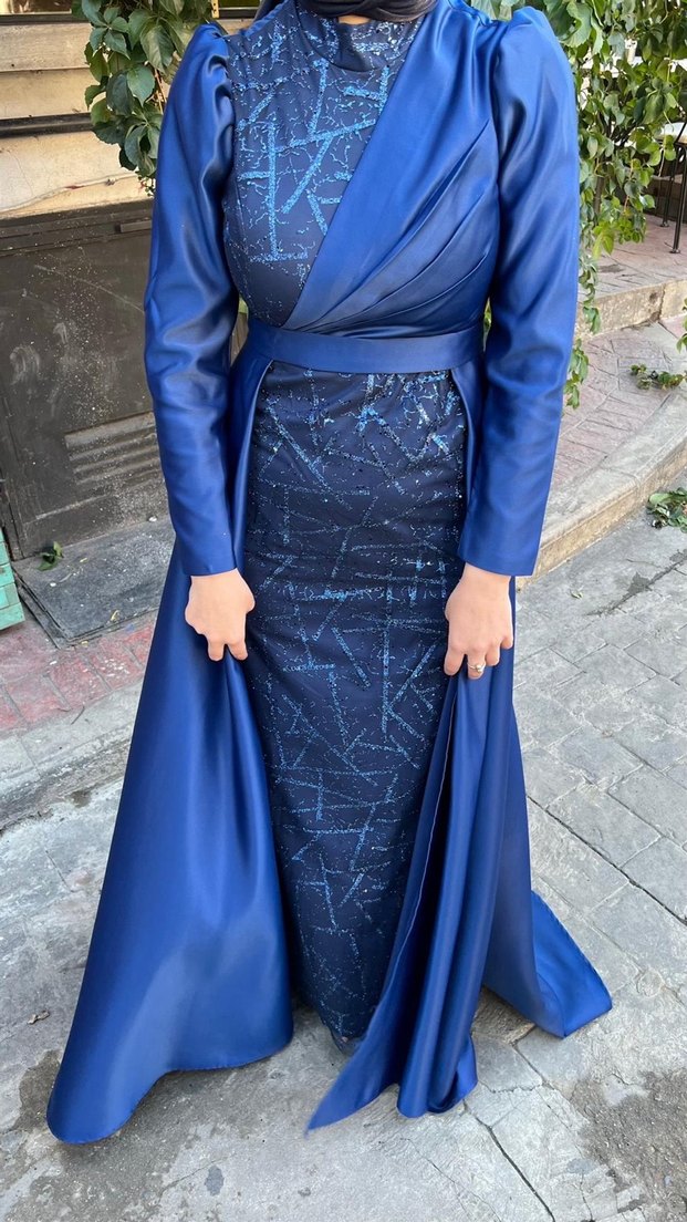 Uzun, koyu mavi renkli abiye elbise, drapeli tasarımı, yakalı ve uzun kollu modeliyle gösterişli ve mütevazı bir şıklık sunar.