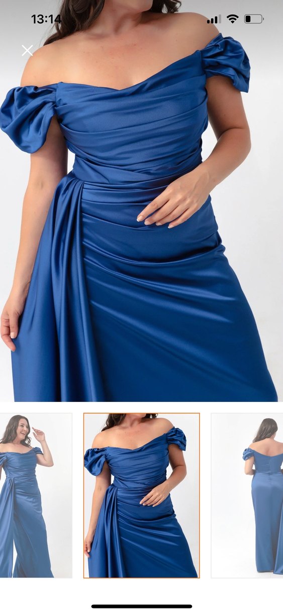 Drapeli tasarıma sahip, mavi uzun abiye elbise, tekne yaka ve askılı kollara sahiptir, düğünler için uygundur.