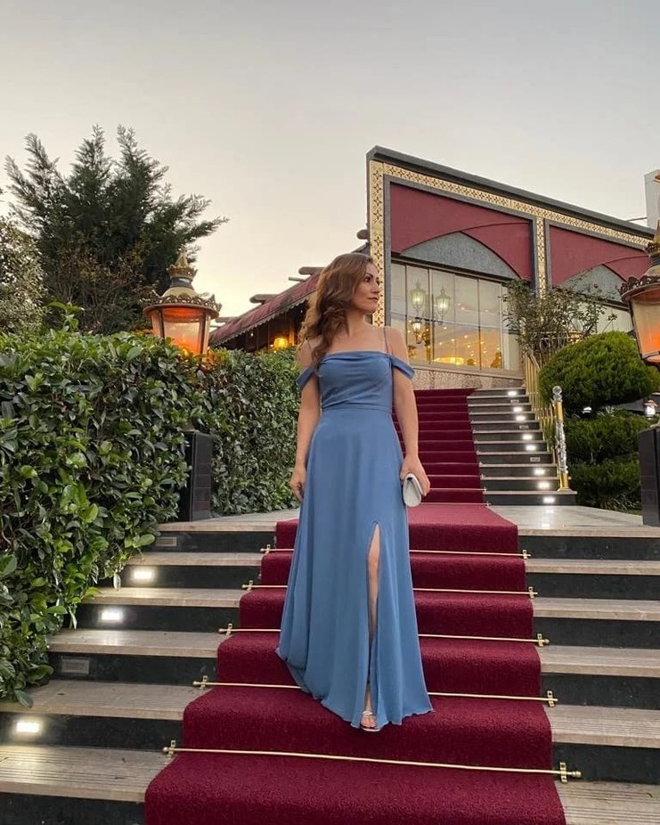 Bu açık mavi abiye elbise, drapeli tasarımı ve askılı straplez kol detaylarıyla dikkat çekiyor. Düzenli kesimi ve modern klasik stiliyle görkemli düğünler için uygun.