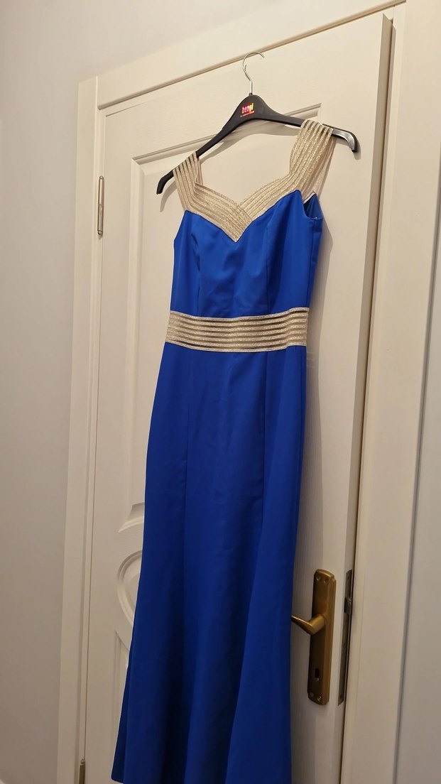 Parlak mavi kumaştan, drapeli askı ve bele sahip, V yakalı, modern klasik tarzda, dar kesim uzun abiye elbise. Düğünler için uygundur.