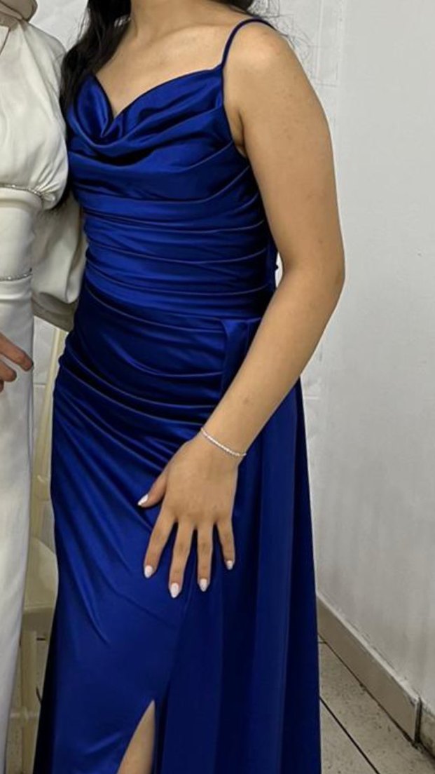 Drapeli ve uzun kesimli, mavi parlak kumaştan yapılmış abiye elbise. Kayık yaka ve ince askılarla klasik ve modern bir şıklık sunar.