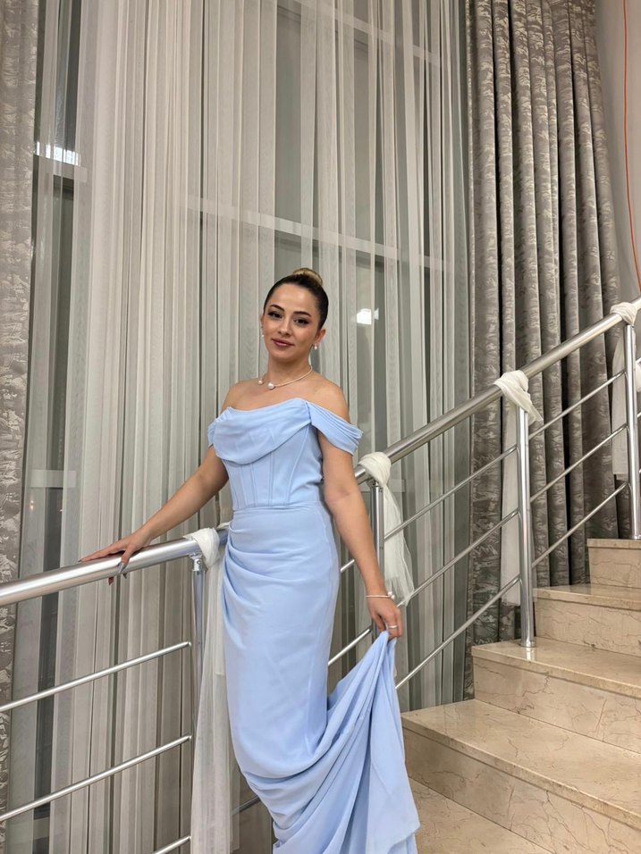 Pastel mavi renkte, drapeli straplez yaka ve uzun kollu abiye elbise. Düz desensiz, klasik. Bir kere düğünde giyildi