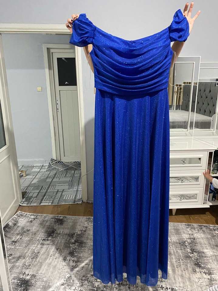 Bu mavi parlak uzun abiye elbise, drapeli ve straplez tasarımıyla şık ve klasik bir görünüm sunar. Düğünler için uygundur.