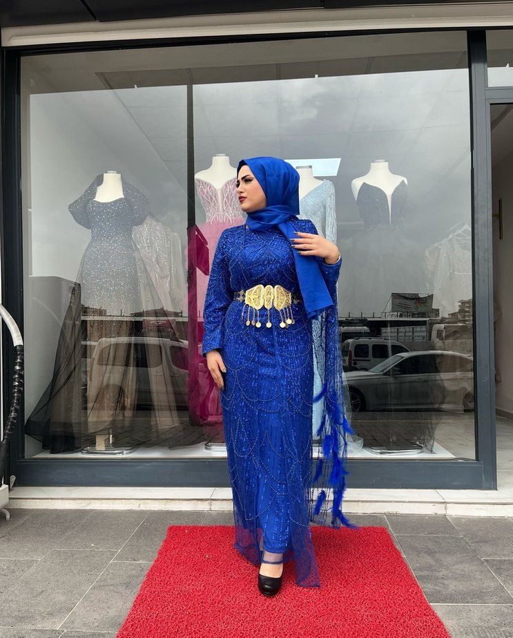 Uzun mavi abiye elbise, yüksek yakalı ve drapeli etnik desenlere sahiptir. Askılı kollu ve regular fit kesimlidir, düğünler için uygundur. ✨