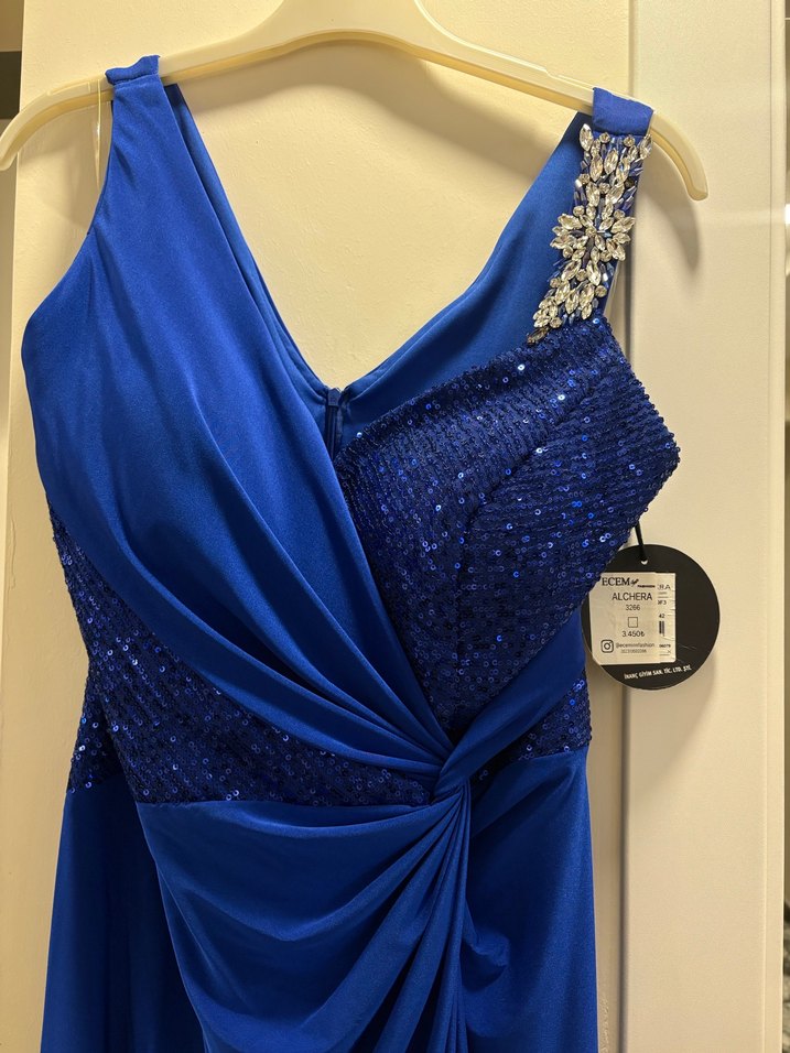 Drapeli, V yakalı ve kolsuz olan bu mavi abiye elbise, işlemeli parlak detaylara sahiptir ve klasik şıklık sunar.
