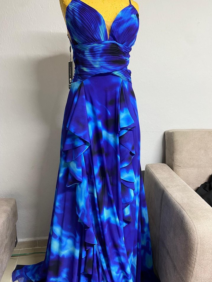 Bu dar kesim abiye elbise, koyu mavi batik desenli, drapeli detaylara ve askılı V yaka tasarıma sahiptir, partiler için uygundur.