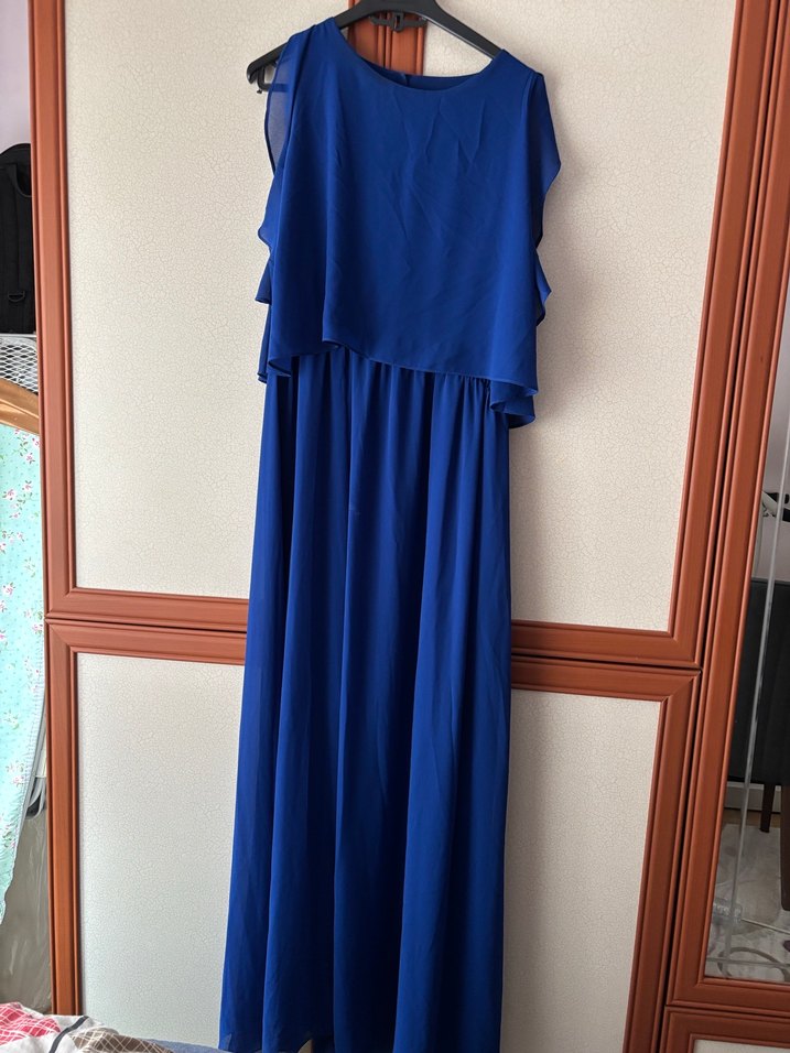 Koyu mavi renkte, drapeli ve askısız uzun kadın elbisesidir. Sentetik, yumuşak kumaştan olup, salaş kesimi ve modern klasik tarzıyla düğünler için uygundur. Kollu olmayan, minimalist ve şık bir tasarıma sahiptir.
