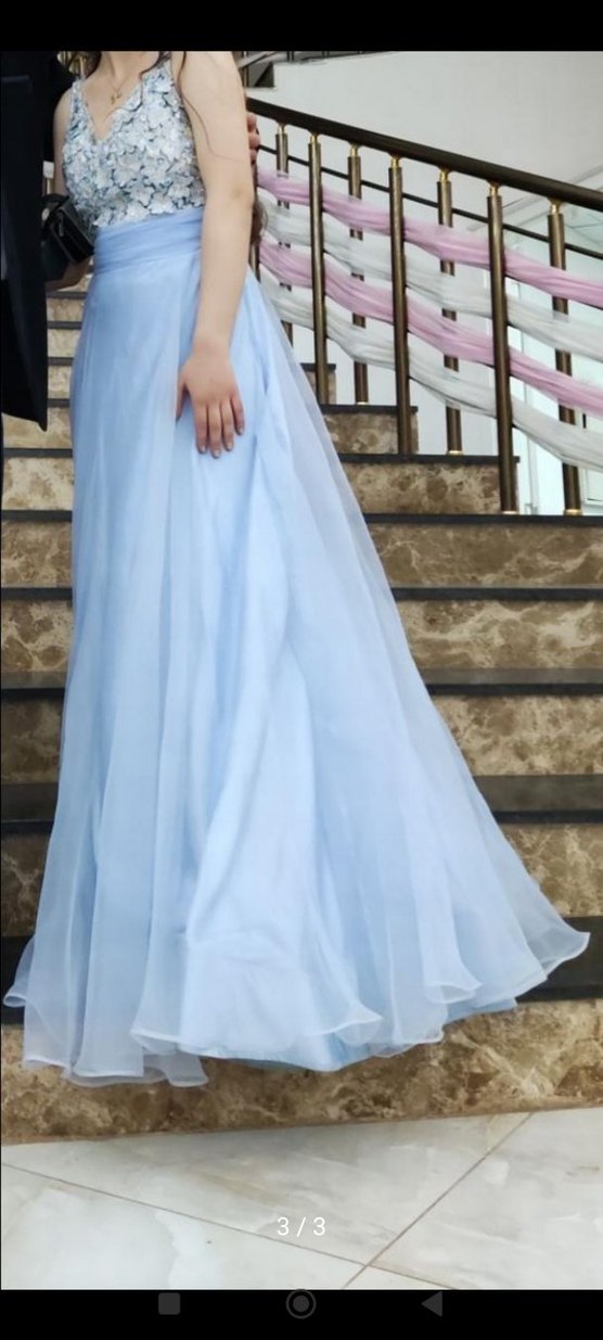 Bu açık mavi uzun elbise, straplez yaka ve ince askılarla loose fit sunar. Drapeli tasarımıyla düğünler için klasik ve göz alıcı bir seçimdir.