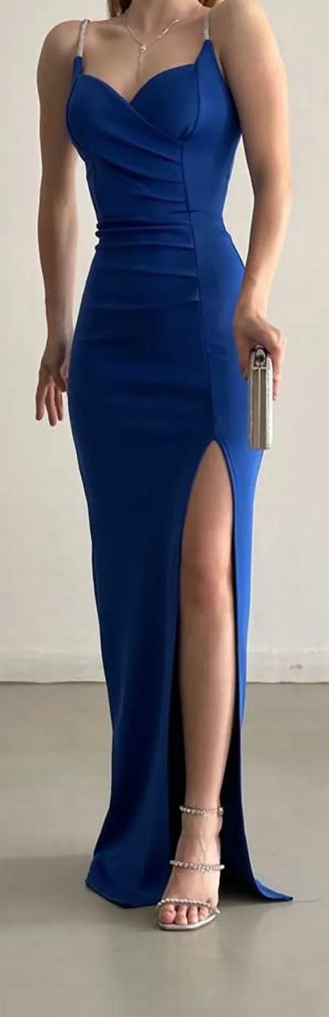 Fitted kesim, uzun mavi abiye elbise ince askılar ve straplez yakaya sahip, drapeli tasarımı ile düğün gibi özel anlar için uygundur. Vücudu saran kalın ama esnek bir kumaşı var Hiç giyilmedi Şuanda mağazaki fiyatı 650 TL civarında