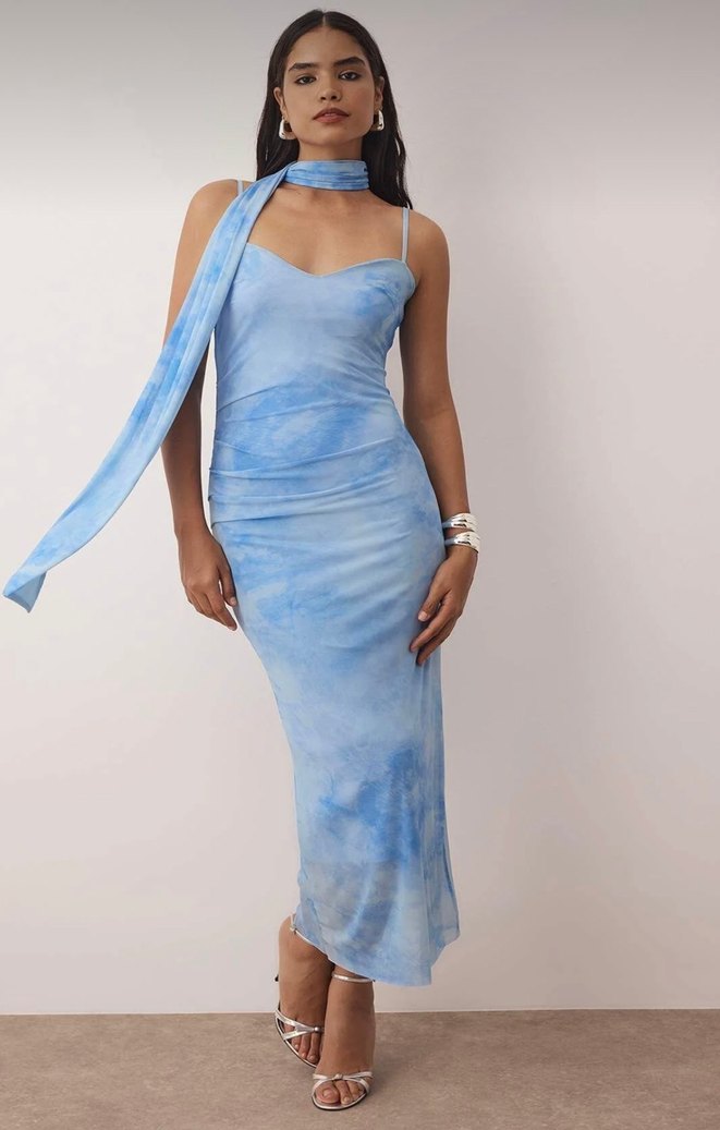 Drapeli, askılı, straplez uzun elbise, pastel mavi batik desenli ve ipeksi dokulu. Düğünler için uygun şık bir model.