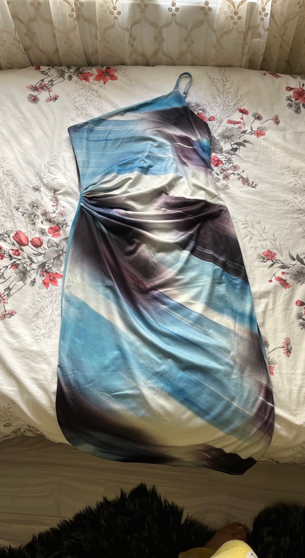 Mavi tonlarda bağlama desenli, askılı ve drapeli uzun elbise. Yumuşak sentetik kumaştan, avant-garde ve çağdaş tarzlar için uygun.