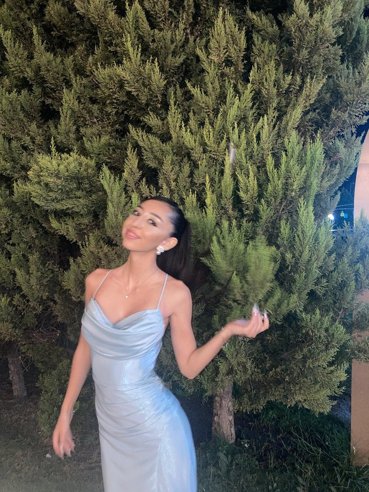 Mavi, uzun ve vücuda oturan abiye, ince askılı drapeli straplez yakaya sahiptir. Partiler için şık ve trend moda tarzını yansıtır. Normcore stilde, pastel ve desensizdir.