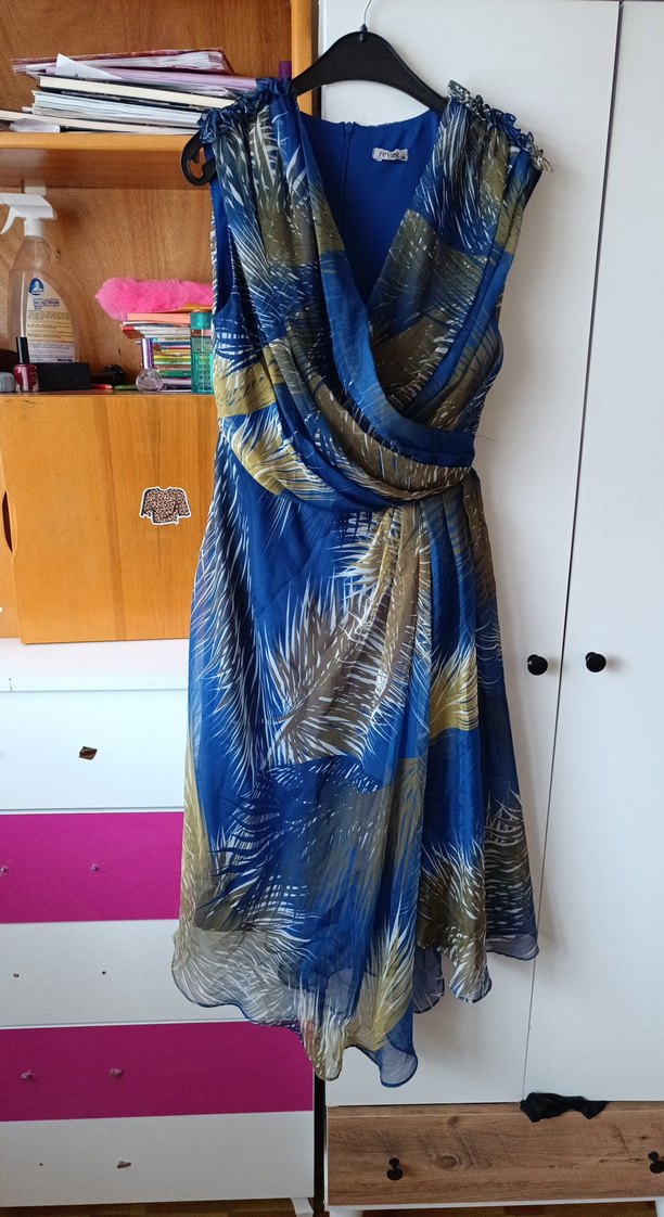Mavi, drapeli, askısız uzun elbise, sentetik kumaştan ve bol kesim. Koyu tie-dye desenli, parti için uygun.