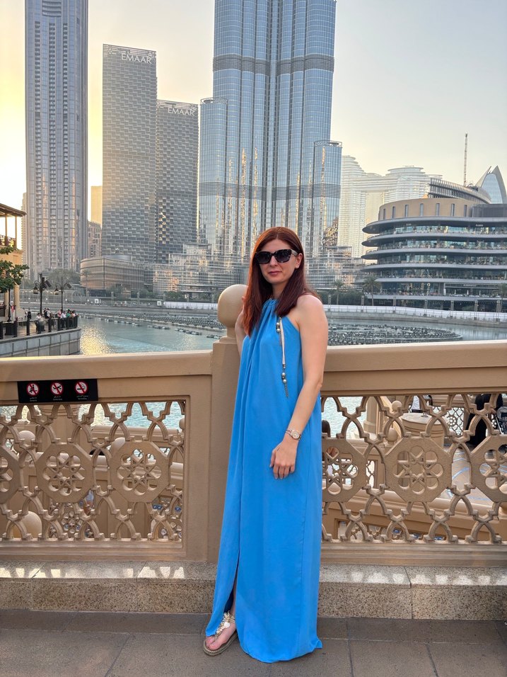 Mavi, askısız altın yaka detay, drapeli, uzun ve bol kesim elbise. İpeksi parlak kumaşıyla bohem sokak stiline uygun, rahat ve şık dış mekan görünümü sağlar.