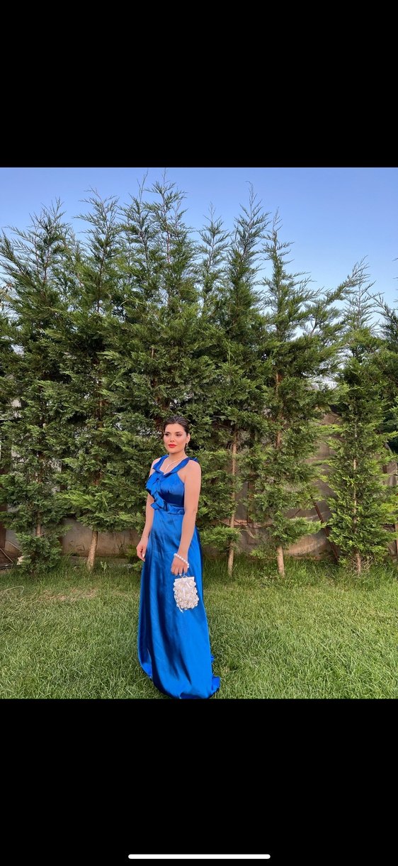 Mavi, drapeli ve parlak tie-dye desenli, uzun, straplez ve kolsuz nişan elbisesi, klasik zarafeti bohem tarzla buluşturuyor ben 38-40 beden giyiyorum bedeni olmadığı için 42 alıp daralttırdım.