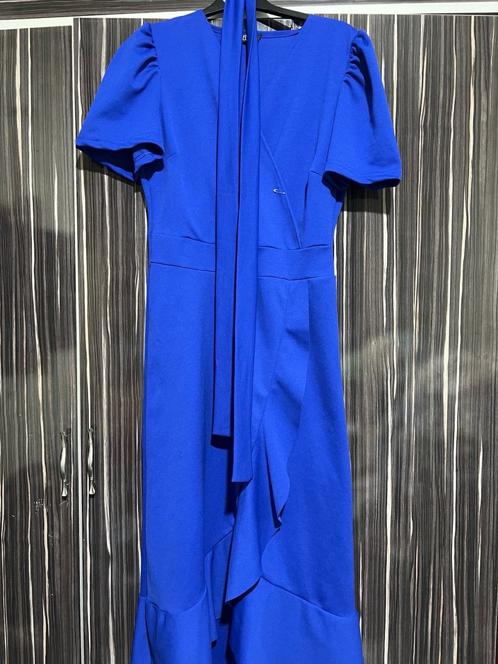 Koyu mavi renkte, drapeli uzun elbise. Kısa kollu, yakası kesik ve sentetik kumaştan üretilmiştir. Ofis için uygundur. Düğünlük falan bence ama ztn fotoğrafta düzgün bir şekilde çektim hiç giyilmedi