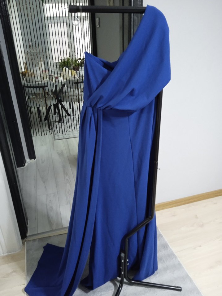 Bu koyu mavi gece elbisesi, drapeli tasarımı, straplez yaka ve ince askıları ile çağdaş ve regular fit kesime sahiptir 1 kez giyildi