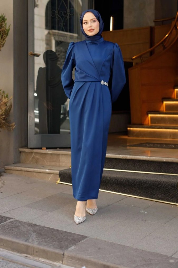 Mavi Drapeli Uzun Kadın Abiye Elbise