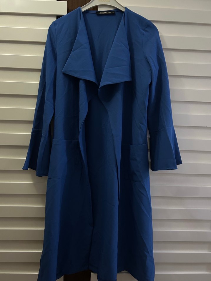 Mavi renkte, drapeli ve uzun kollu kadın ceket . Notch yaka detayı ve regular kesimiyle günlük kullanıma uygundur. Herhangi bir sıkıntısı yok