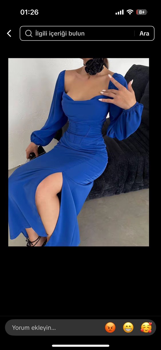 Bu dar kesim uzun elbise, drapeli tekne yakası ve askılı kollara sahiptir. Koyu mavi, ipeksi kumaştan, ışıltılı ve çağdaş bir tarz sunar. L beden ama M bedenlerde tercih edebilir