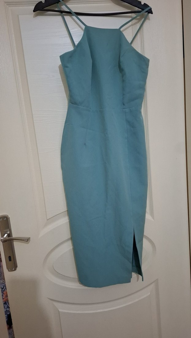 Kolsuz, pastel mavi uzun elbise, kesik yakalı ve drapeli tasarıma sahiptir. Regular fit ve yırtmaçlı, ofis için uygun.