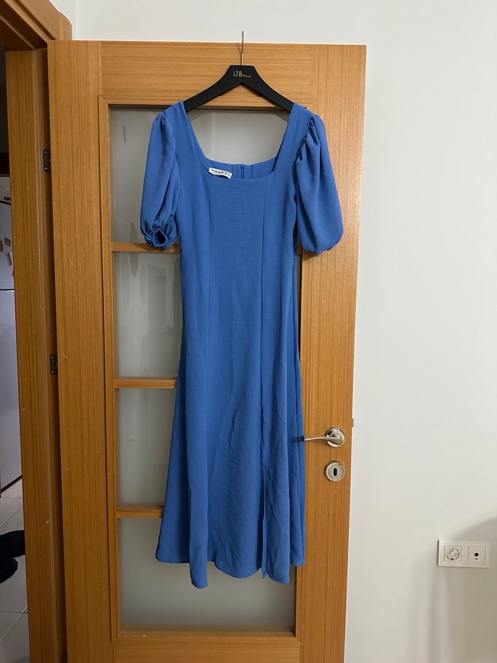 Kısa balon kollu, yırtmaçlı, drapeli uzun mavi elbise. Yumuşak sentetik kumaştan, yuvarlak yakalı ve bol kesimdir. Belden oturur. Rahat günlük kullanım için uygundur.