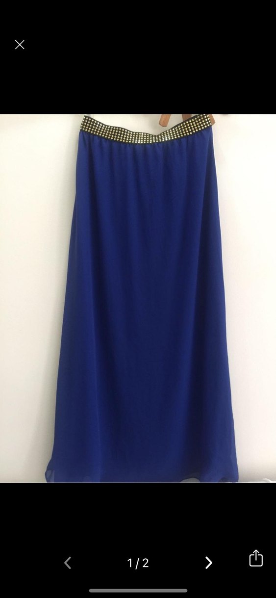 Parlak mavi sentetik kumaştan, drapeli ve bol kesim uzun kadın eteği, çivili bel bandıyla minimalist bohem tarzda günlük kullanım için uygundur.