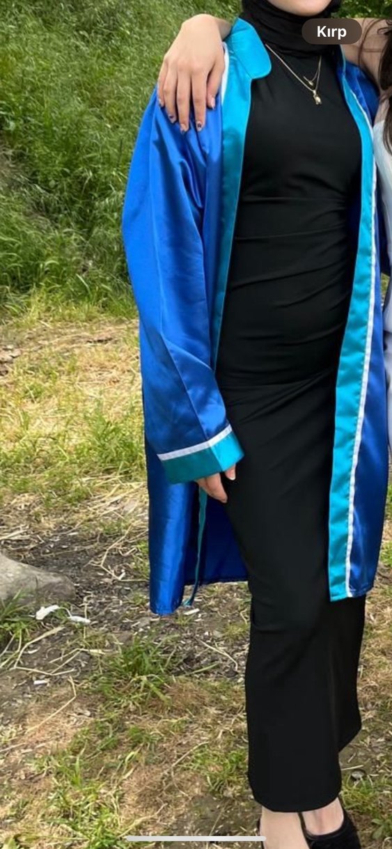 Uzun, drapeli mavi mezuniyet elbisesi, yakasında kesikli yaka ve uzun kollu. Parlak dokusuyla şık bir sokak stili sunar. Açık hava etkinlikleri için uygundur. Bir kes giyildi