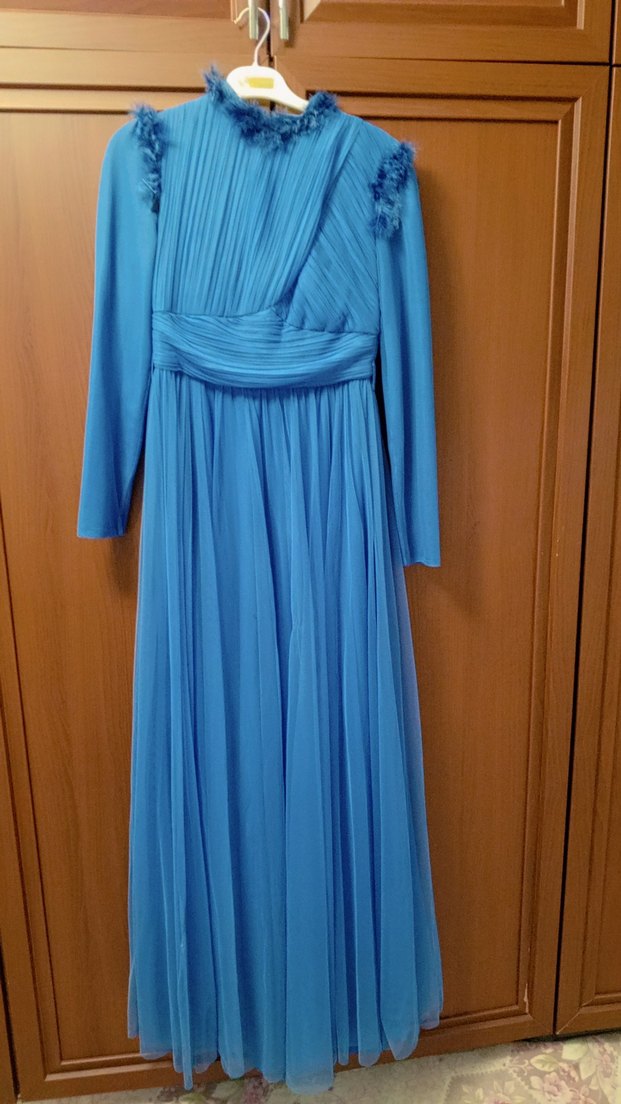 Drapeli detaylı, uzun kollu ve yüksek yakalı, pastel mavi tonlarında etek ucunda hafif bi defosu var ama girildiğinde belli olmuyo bile