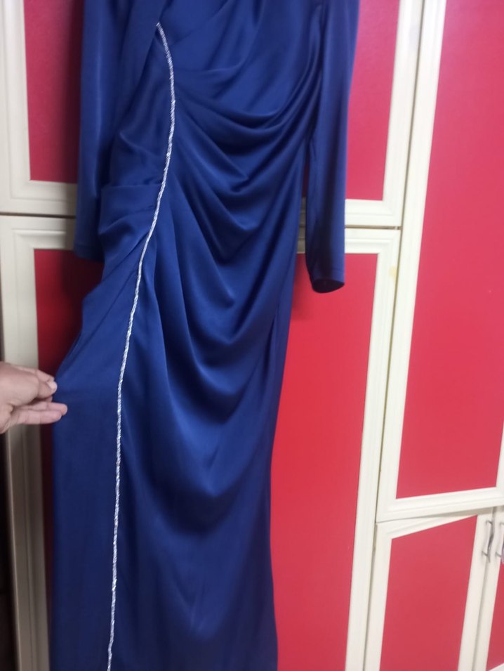 Drapeli detaylı, uzun kollu ve yüksek yakalı mavi parlak kumaştan, minimal ve sade tasarımlı, düğünlere uygun abiye elbise. 42-44 uyumlu kuyrugu vardıe hafıf rengi koyudur ısıktan oyle cıkmıs esarbıda vardır