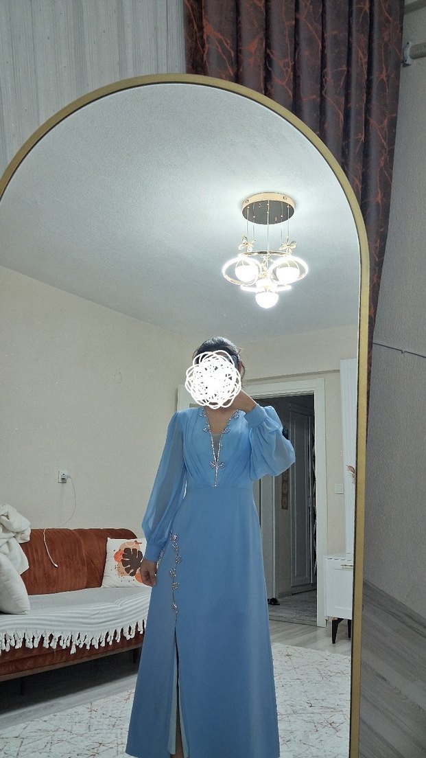 Açık mavi, yüksek yakalı ve uzun kollu uzun abiye elbise. Bol kesim ve drapeli tasarıma sahip, sade ve mütevazı tarz için uygun. ✨