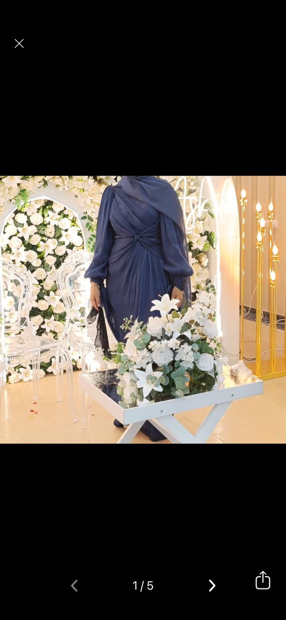 Bu koyu mavi uzun abiye elbise drapeli tasarımı, yüksek yakası ve çiçek desenleriyle dikkat çeker. Uzun kollu ve düzenli kesimdir, mütevazı ve Parisli bohem tarzını yansıtır. 5 metre Şal ile gönderim yapılacaktır . Son fotoda elbise altında deformeler vardır .