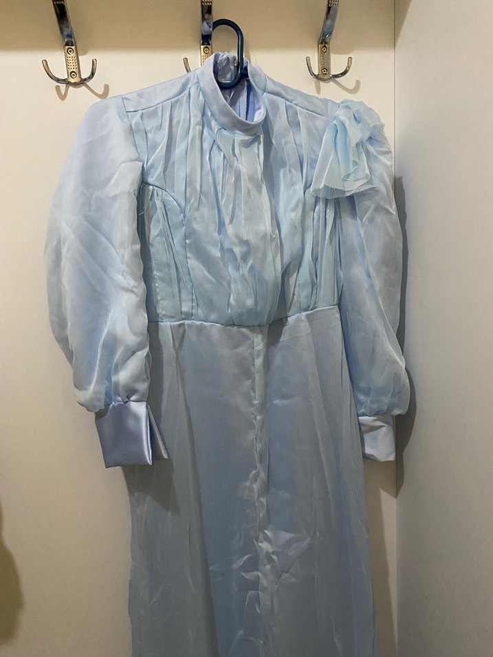 Mavi renkte, yakalı ve uzun kollu drapeli uzun elbise. Bol kesim ve vintage bohem tarzıyla ofis için uygun.