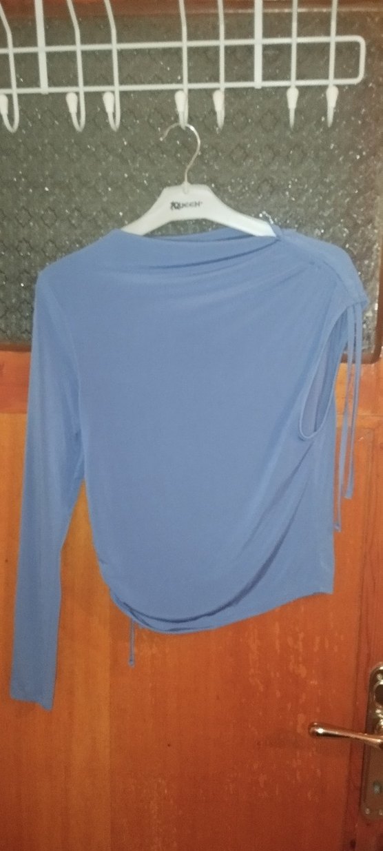 Pastel mavi renkte, uzun kollu ve yuvarlak yakalı, drapeli tasarıma sahip, oturan kesim kadın bluz. Yumuşak sentetik kumaştan, günlük dış mekan kullanımı için uygundur.