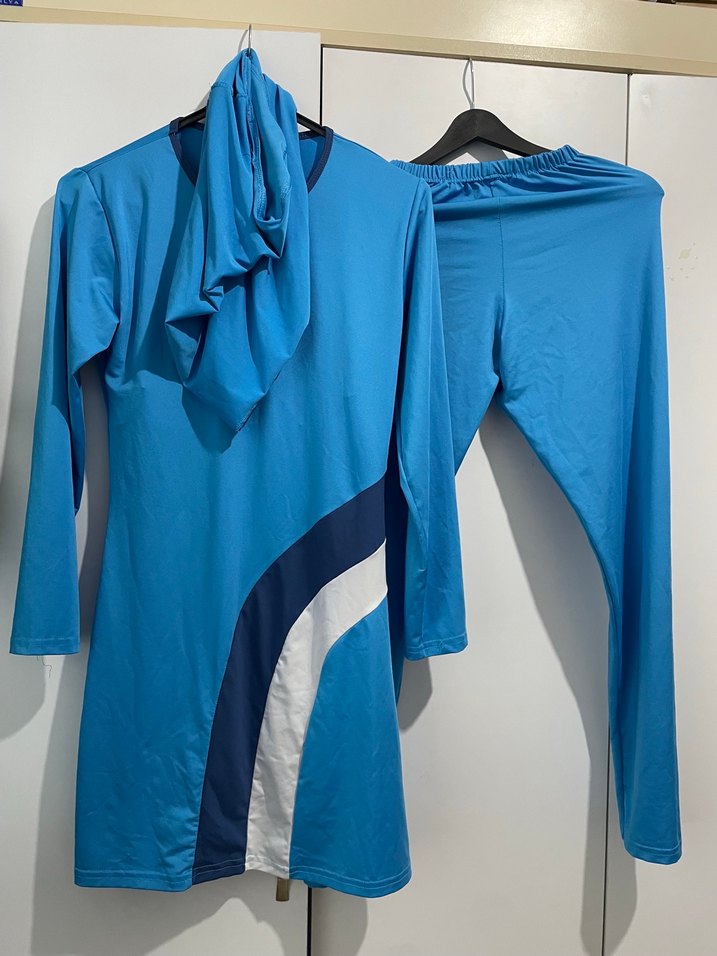 Parlak mavi renkte, drapeli ve uzun kollu,kadın mayo takımı. Üstte beyaz ve koyu mavi detaylar bulunur, taytıyla uyumludur. ♀️