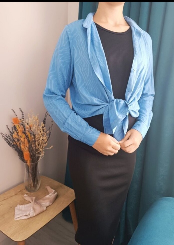 Drapeli tasarıma sahip, uzun kollu, yakalı, koyu mavi ofis gömleği. Sentetik kumaştan, midi boy ve fitted kesimle uyumlu.