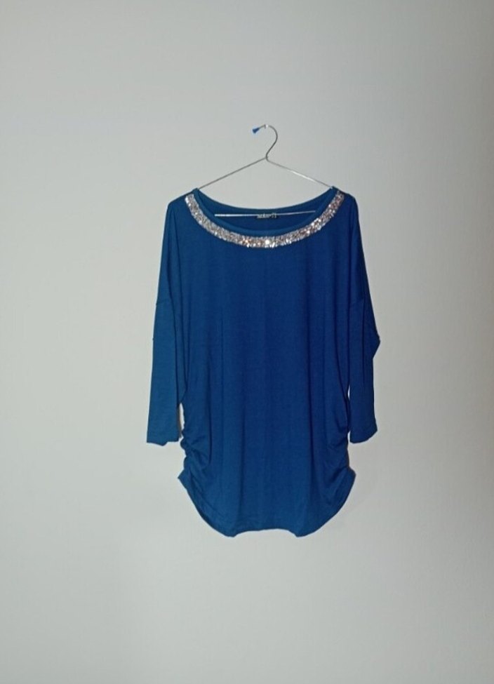 Mavi renkte, parlak detaylı yuvarlak yakalı ve uzun kollu bluz. Salaş kesim ve drapeli tasarıma sahip, sentetik kumaştan üretilmiştir. Günlük kullanım için uygundur. marka temsilidir