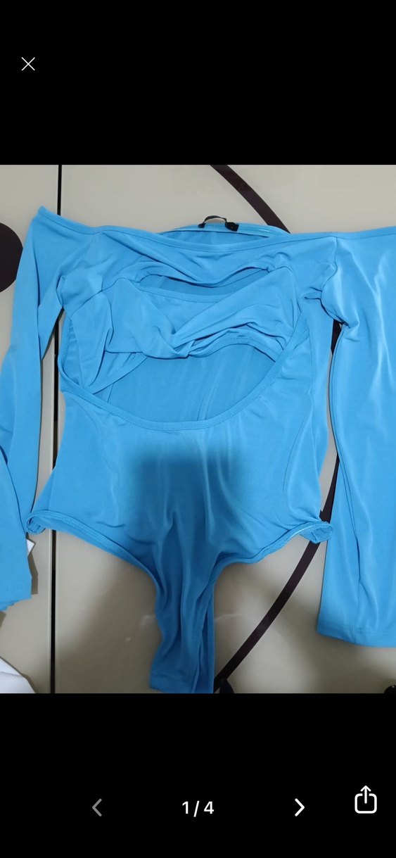 Dar kesim mavi bluz, straplez yaka ve drapeli detaylara sahip. Uzun, ince askılı kollu ve sentetik kumaştan üretilmiştir. Sokak modasına uygun.