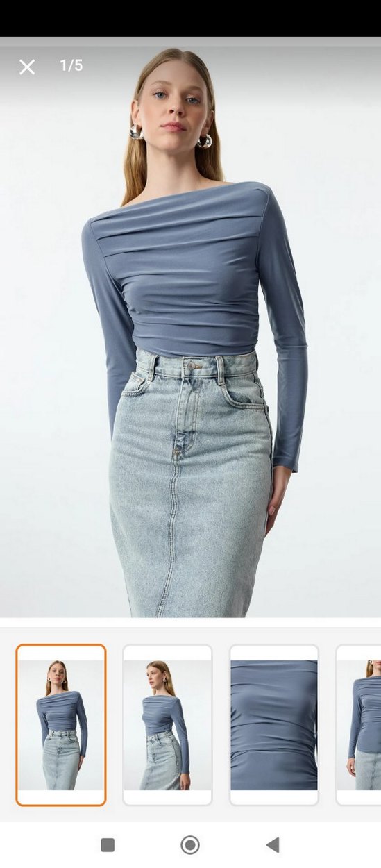 mavi renkli, tekne yaka ve uzun kollu, drapeli tasarıma sahip, denim kumaştan üretilmiş, günlük kullanıma uygun dar kesim bluz.
