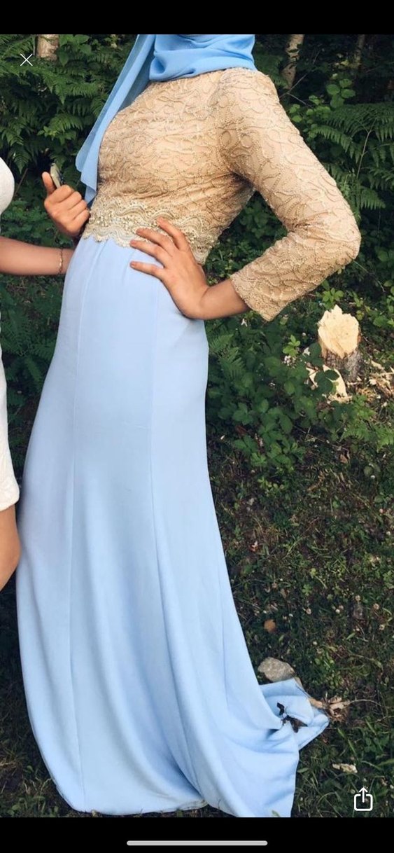 Mavi Drapeli Uzun Kollu Uzun Abiye