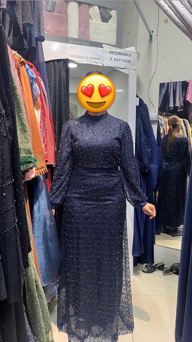 Mavi, parlak uzun gece elbisesi yüksek yakalı ve uzun kollu, drapeli tasarıma sahiptir. Düzenli kesim ve mütevazı stilde, ışıltılı tie-dye desenlidir.