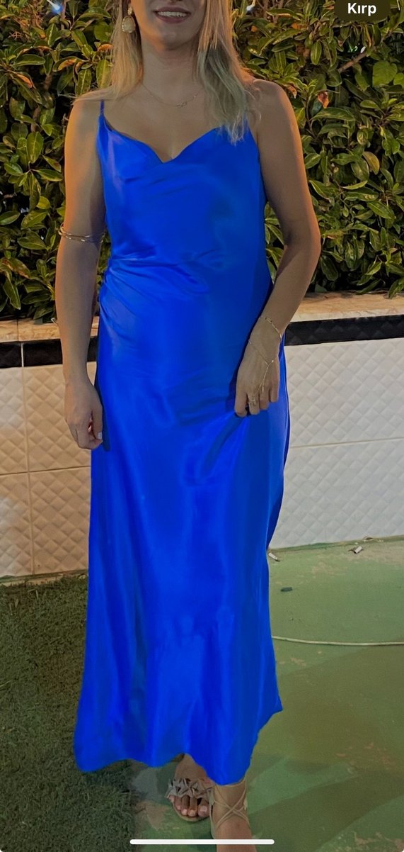 Mavi, uzun, drapeli ve bol kesim elbise. İpek hissi veren kumaştan, V yaka ve ince askılı. Hafif batik desenli, bohem tarz için uygun. Saten elbise