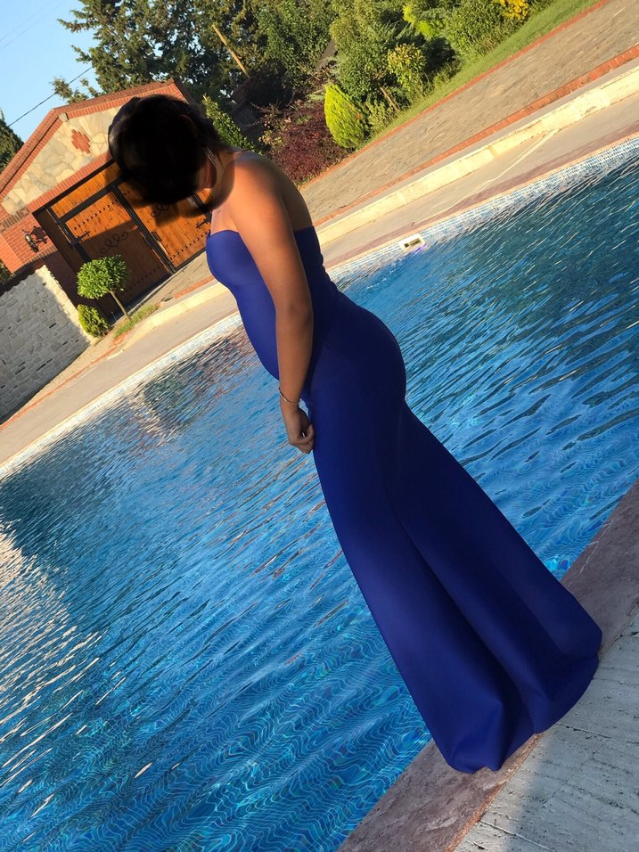 Mavi renkte, drapeli ve parlak kumaştan yapılmış, straplez ve vücuda oturan uzun abiye elbisedir. Gösterişli düğünler için uygundur.✨