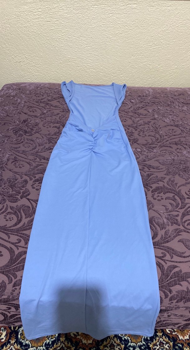 Mavi pastel renkte, yumuşak sentetik kumaştan yapılmış, drapeli ve straplez yaka uzun, vücuda oturan kolsuz elbisedir. Minimalist ve normcore tarzlar için uygundur.