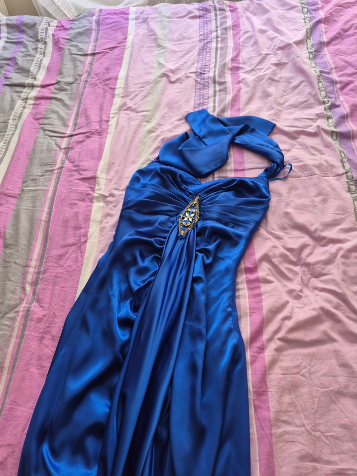 Uzun mavi abiye, straplez ve drapeli tasarımıyla dikkat çeker. İnce askılı ve vücuda oturan kesimi, parlak kumaşı ve süslemeli detaylarıyla düğünler için uygundur. ufak bı leke var cıkarmı bılemıprum resımde belirttim bi kaç tası resimdkei gibi düşmüştür baska bir kusuru yoktur s-m-l bedenler tercih edebilir bana buyuk oldugu ıcın satısta boyum 160 kilom 42
