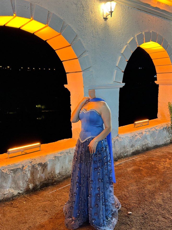 Mavi Drapeli Uzun Straplez Kadın Abiye